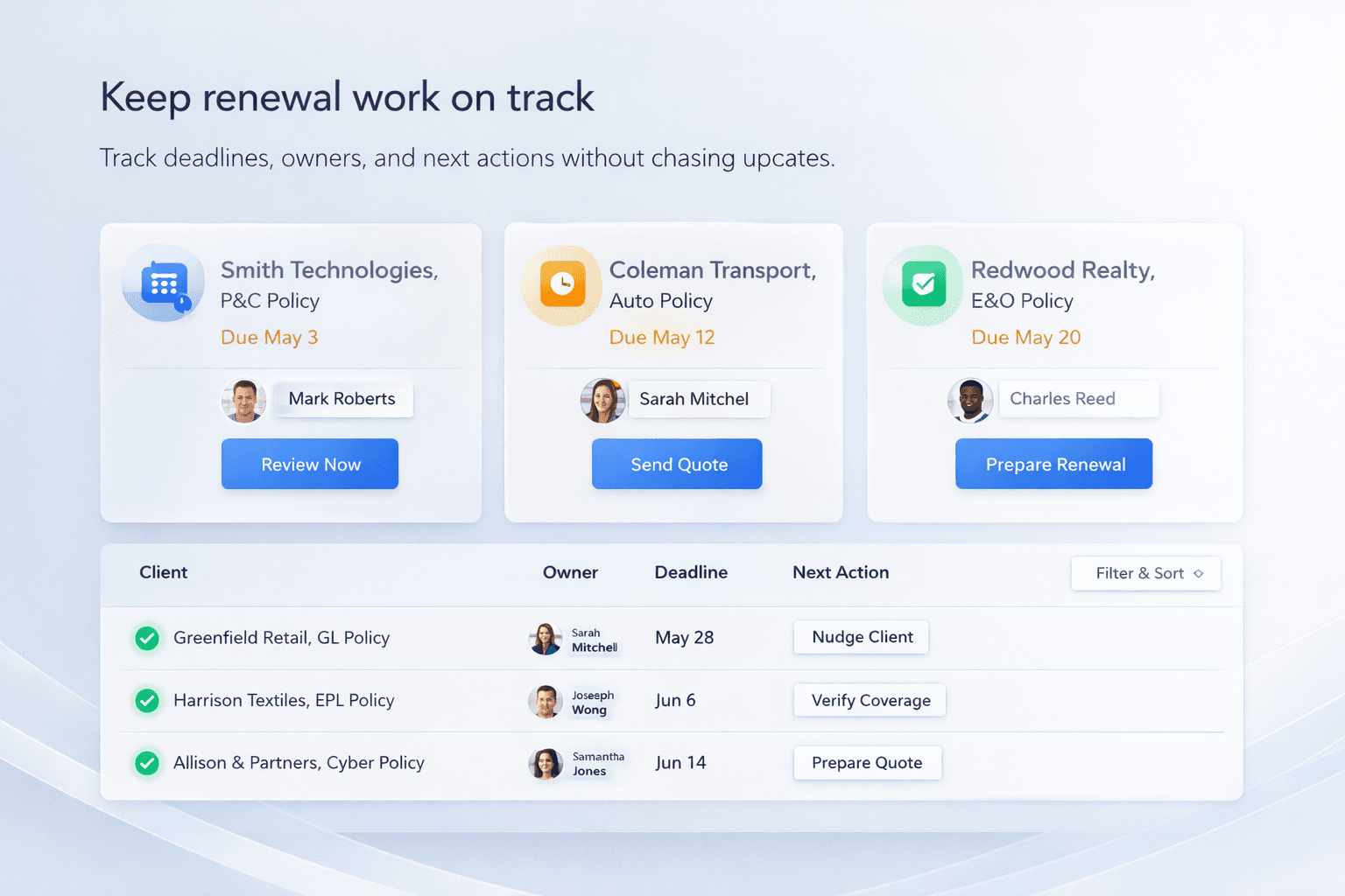 Track deadlines, owners, and next actions without chasing updates.