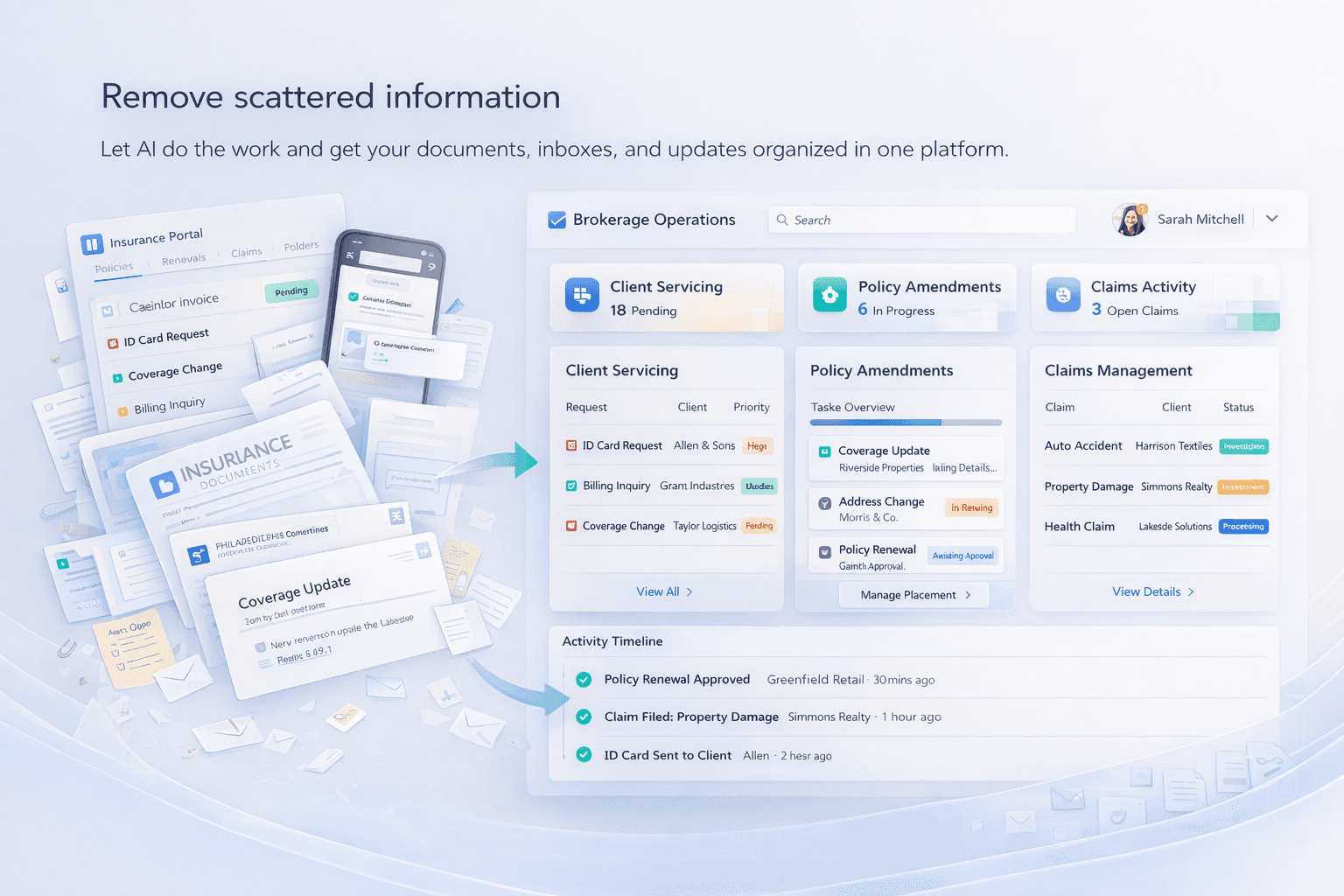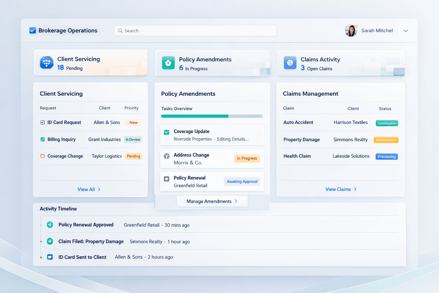 Manage client requests, policy changes, and claims activity in one place.